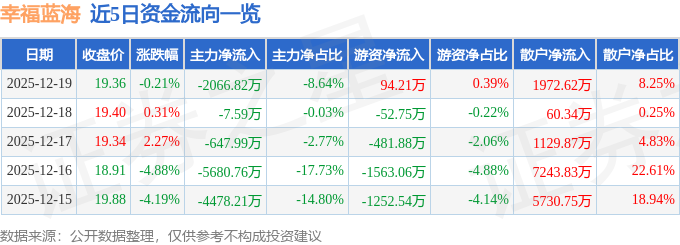 证券之星消息,截至2025年12月19日收盘,幸福蓝海(300528)报收于19.36元,下跌0.21%,换手率3.36%,成交量12.51万手,成交额2.39亿元。