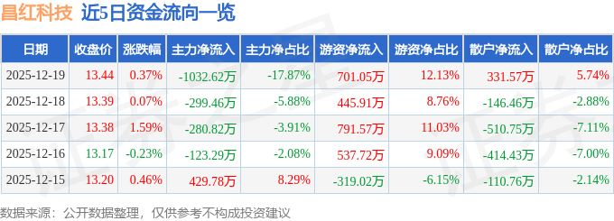 证券之星消息,截至2025年12月19日收盘,昌红科技(300151)报收于13.44元,上涨0.37%,换手率1.17%,成交量4.31万手,成交额5778.3万元。