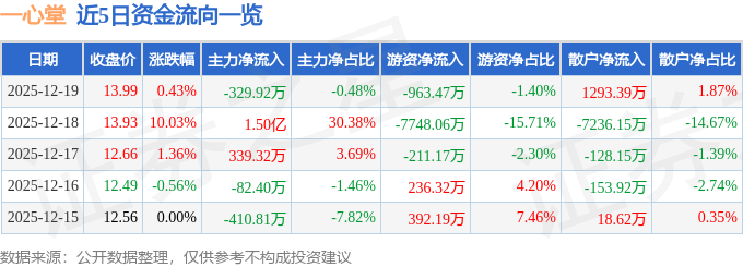 证券之星消息,截至2025年12月19日收盘,一心堂(002727)报收于13.99元,上涨0.43%,换手率12.46%,成交量49.49万手,成交额6.9亿元。
