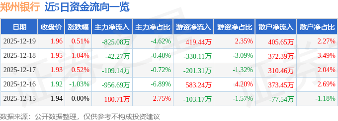 证券之星消息,截至2025年12月19日收盘,郑州银行(002936)报收于1.96元,上涨0.51%,换手率1.3%,成交量91.39万手,成交额1.79亿元。