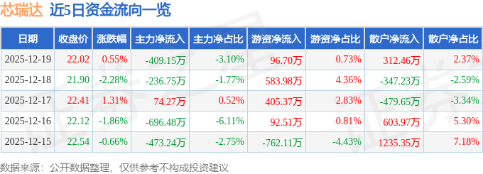 证券之星消息,截至2025年12月19日收盘,芯瑞达(002983)报收于22.02元,上涨0.55%,换手率4.69%,成交量6.01万手,成交额1.32亿元。
