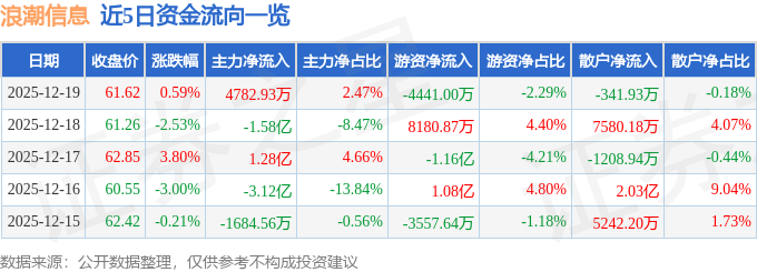 证券之星消息,截至2025年12月19日收盘,浪潮信息(000977)报收于61.62元,上涨0.59%,换手率2.13%,成交量31.17万手,成交额19.39亿元。