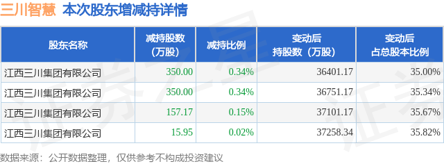 证券之星消息,12月19日三川智慧发布公告《三川智慧:简式权益变动报告书》,其股东江西三川集团有限公司于2025年10月15日至2025年12月19日间合计减持873.12万股,占公司目前总股本的0.8394%,变动期间该股股价下跌16.45%,截止12月19日收盘报6.3元。