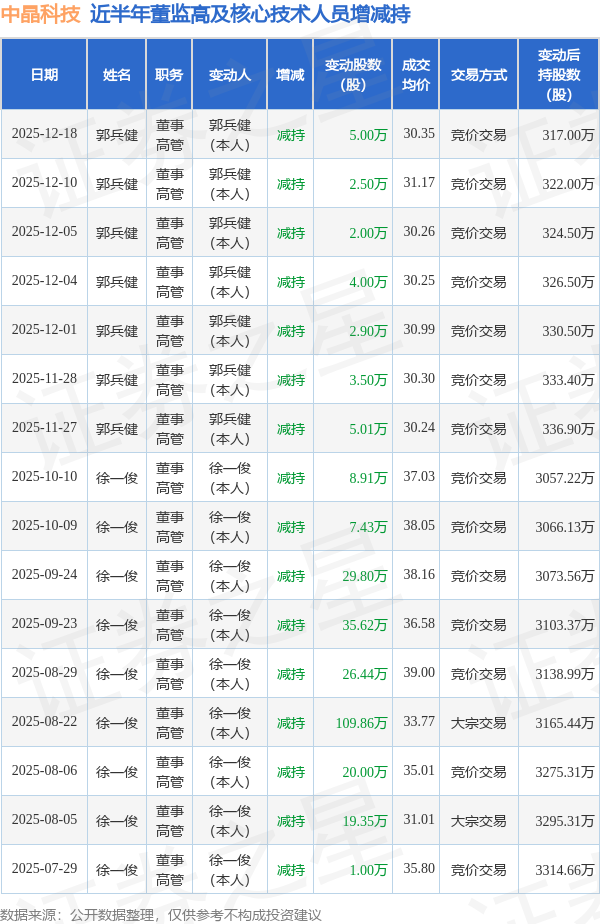 中晶科技近半年内的董监高及核心技术人员增减持详情如下: