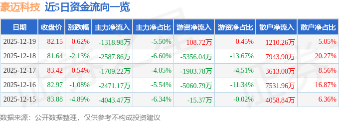 证券之星消息,截至2025年12月19日收盘,豪迈科技(002595)报收于82.15元,上涨0.62%,换手率0.37%,成交量2.91万手,成交额2.4亿元。