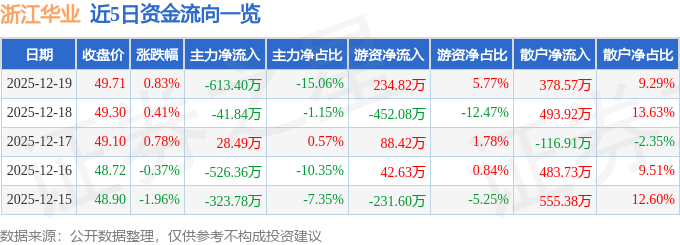 证券之星消息,截至2025年12月19日收盘,浙江华业(301616)报收于49.71元,上涨0.83%,换手率4.09%,成交量8188.0手,成交额4072.96万元。