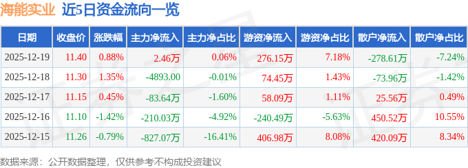 证券之星消息,截至2025年12月19日收盘,海能实业(300787)报收于11.4元,上涨0.88%,换手率1.77%,成交量3.38万手,成交额3847.32万元。