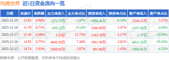 证券之星消息,截至2025年12月19日收盘,完美世界(002624)报收于15.85元,上涨0.96%,换手率1.6%,成交量29.15万手,成交额4.6亿元。