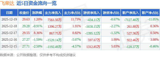 证券之星消息,截至2025年12月19日收盘,飞荣达(300602)报收于29.63元,上涨1.2%,换手率5.52%,成交量21.81万手,成交额6.45亿元。