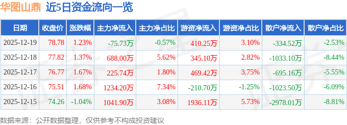 证券之星消息,截至2025年12月19日收盘,华图山鼎(300492)报收于78.78元,上涨1.23%,换手率0.85%,成交量1.68万手,成交额1.32亿元。