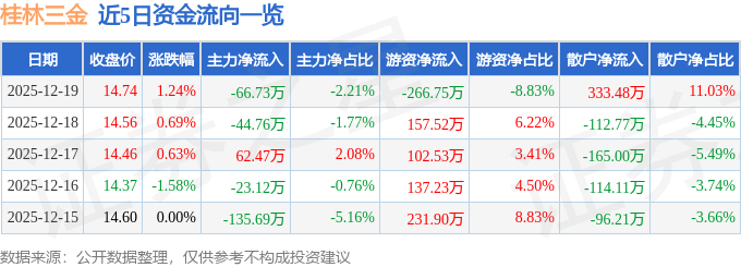 证券之星消息,截至2025年12月19日收盘,桂林三金(002275)报收于14.74元,上涨1.24%,换手率0.37%,成交量2.06万手,成交额3022.17万元。