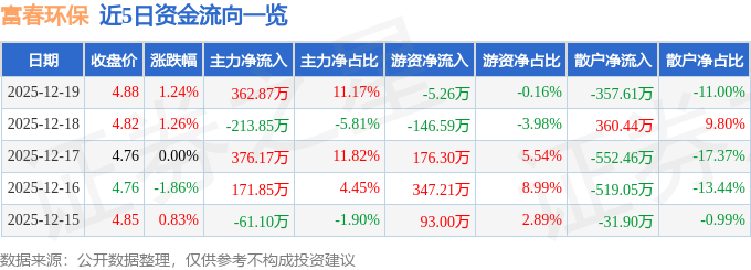 证券之星消息,截至2025年12月19日收盘,富春环保(002479)报收于4.88元,上涨1.24%,换手率0.77%,成交量6.68万手,成交额3249.95万元。