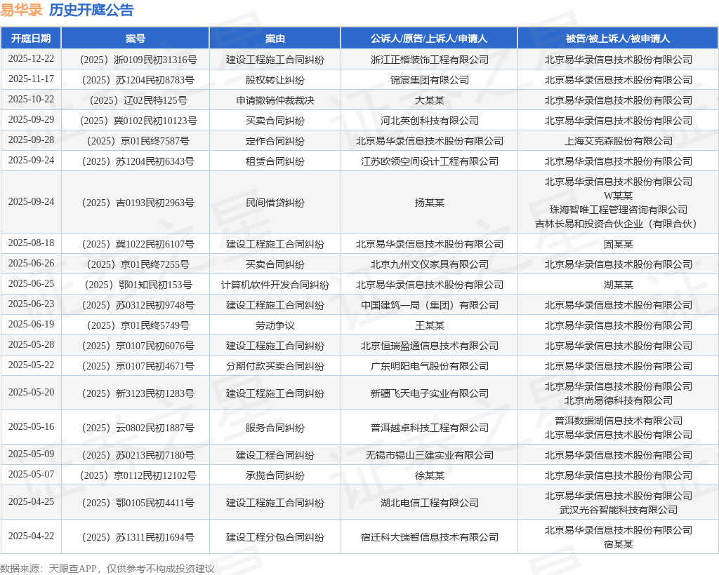 案号:(2025)浙0109民初31316号根据统计,近一年内以北京易华录信息技术股份有限公司为当事人的历史开庭公告有37则,其中案由为“建设工程施工合同纠纷”的公告以12则居首,其次为“买卖合同纠纷”有5则,“劳动争议”有4则。历史开庭公告(前20条)如下: