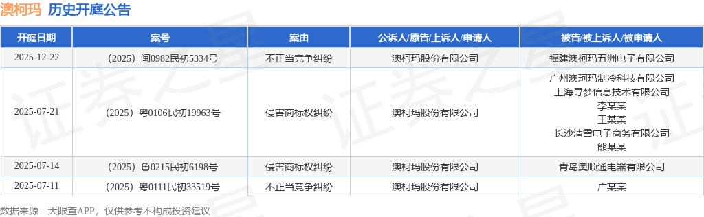 根据统计,近一年内以澳柯玛股份有限公司为当事人的历史开庭公告有4则,其中案由为“不正当竞争纠纷”的公告以2则居首,其次为“侵害商标权纠纷”有2则。历史开庭公告如下: