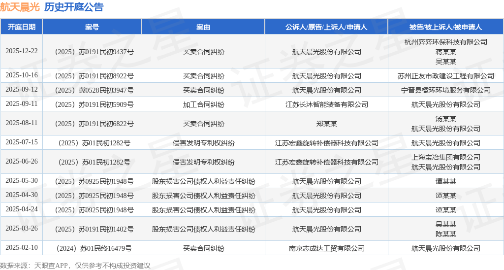 案号:(2025)苏0191民初9437号根据统计,近一年内以航天晨光股份有限公司为当事人的历史开庭公告有12则,其中案由为“买卖合同纠纷”的公告以5则居首,其次为“股东损害公司债权人利益责任纠纷”有4则,“侵害发明专利权纠纷”有2则。历史开庭公告如下: