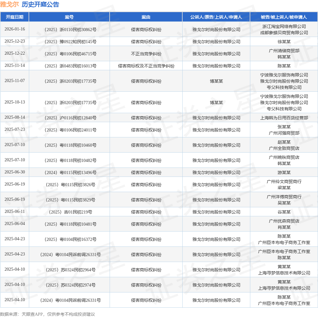 案号:(2025)粤0106民初46715号根据统计,近一年内以雅戈尔时尚股份有限公司为当事人的历史开庭公告有32则,其中案由为“侵害商标权纠纷”的公告以30则居首,其次为“不正当竞争纠纷”有1则,“侵害商标权及不正当竞争纠纷”有1则。历史开庭公告(前20条)如下: