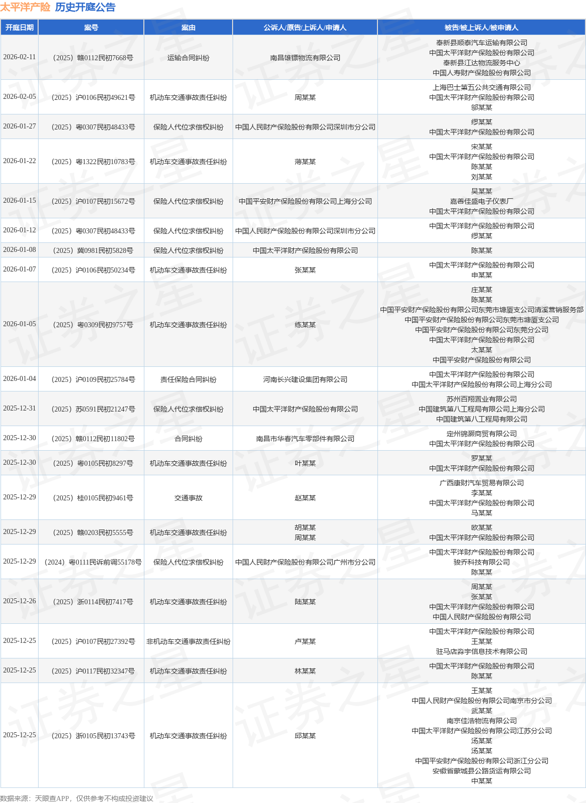 案号:(2025)沪0112民初49351号根据统计,近一年内以中国太平洋财产保险股份有限公司为当事人的历史开庭公告有694则,其中案由为“机动车交通事故责任纠纷”的公告以451则居首,其次为“保险人代位求偿权纠纷”有79则,“非机动车交通事故责任纠纷”有28则。历史开庭公告(前20条)如下: