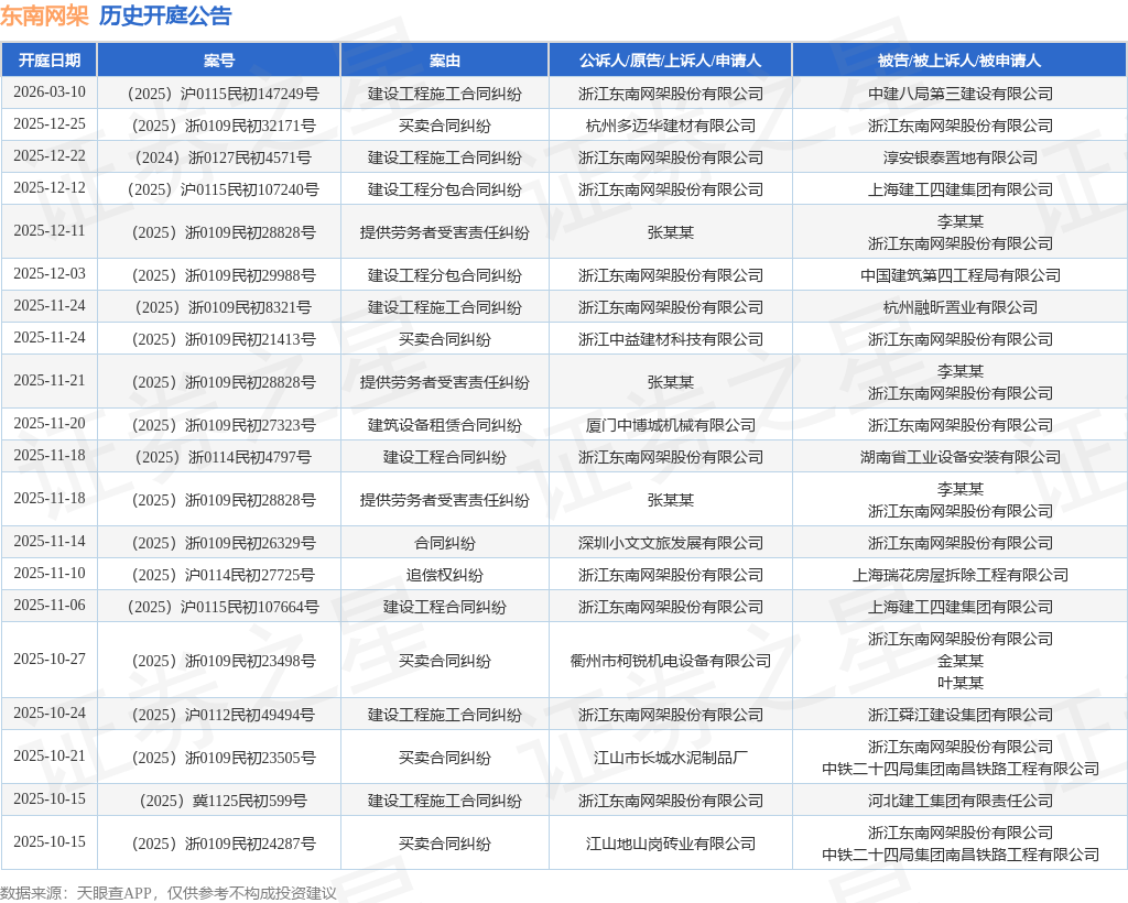 案号:(2024)浙0127民初4571号根据统计,近一年内以浙江东南网架股份有限公司为当事人的历史开庭公告有65则,其中案由为“建设工程施工合同纠纷”的公告以19则居首,其次为“买卖合同纠纷”有12则,“建设工程分包合同纠纷”有8则。历史开庭公告(前20条)如下: