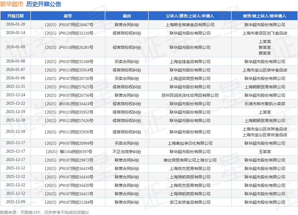 案号:(2025)浙0382民初16424号根据统计,近一年内以联华超市股份有限公司为当事人的历史开庭公告有130则,其中案由为“侵害商标权纠纷”的公告以68则居首,其次为“联营合同纠纷”有17则,“买卖合同纠纷”有14则。历史开庭公告(前20条)如下: