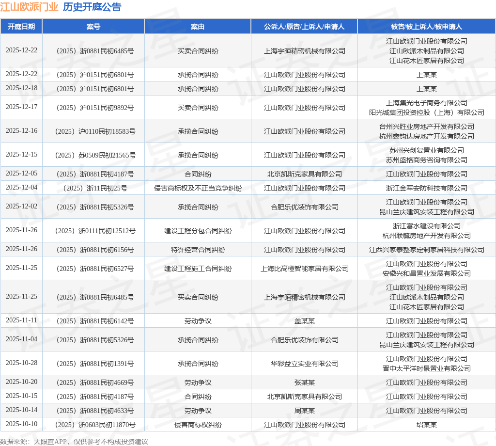 案号:(2025)浙0881民初6485号根据统计,近一年内以江山欧派门业股份有限公司为当事人的历史开庭公告有104则,其中案由为“承揽合同纠纷”的公告以35则居首,其次为“买卖合同纠纷”有22则,“劳动争议”有11则。历史开庭公告(前20条)如下: