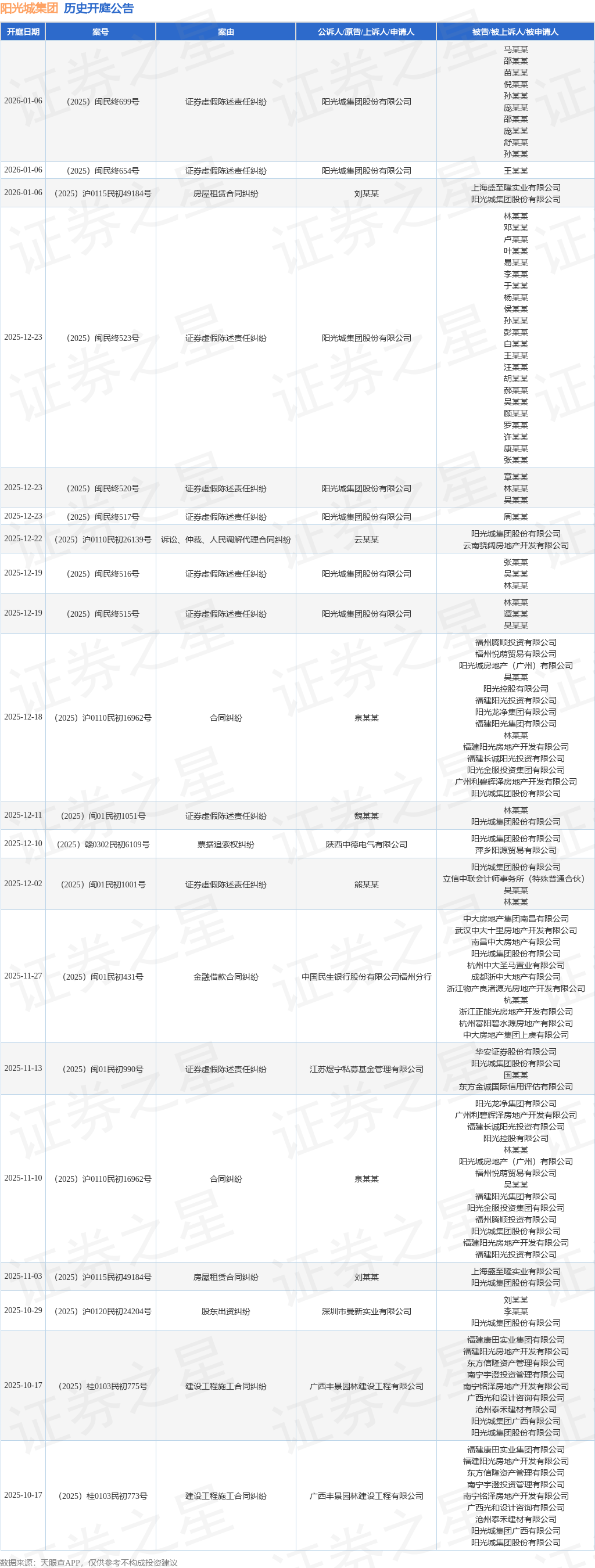 案号:(2025)沪0110民初26139号根据统计,近一年内以阳光城集团股份有限公司为当事人的历史开庭公告有109则,其中案由为“买卖合同纠纷”的公告以29则居首,其次为“票据追索权纠纷”有17则,“证券虚假陈述责任纠纷”有11则。历史开庭公告(前20条)如下: