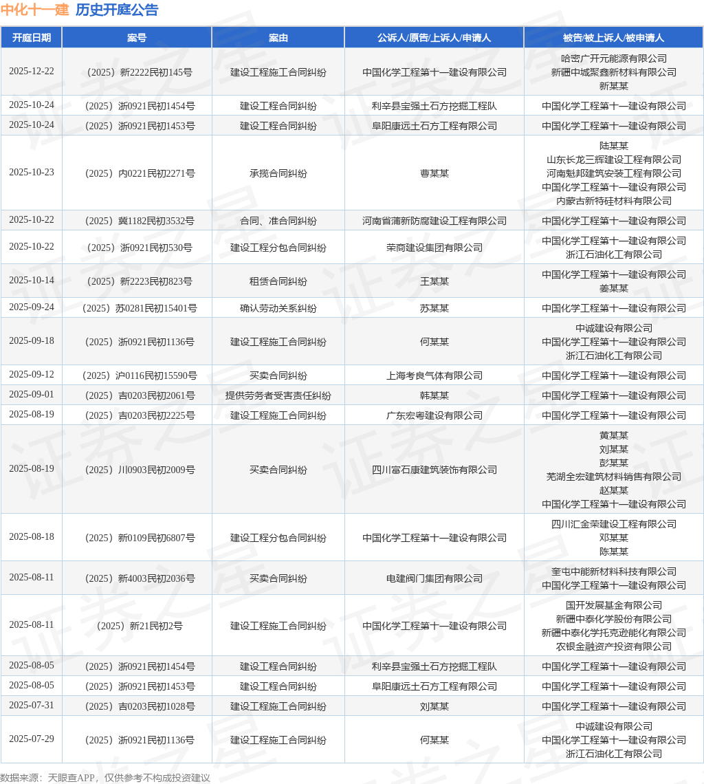 案号:(2025)新2222民初145号根据统计,近一年内以中国化学工程第十一建设有限公司为当事人的历史开庭公告有114则,其中案由为“建设工程施工合同纠纷”的公告以37则居首,其次为“建设工程合同纠纷”有22则,“买卖合同纠纷”有21则。历史开庭公告(前20条)如下: