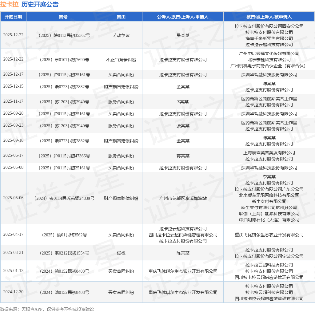 案号:(2025)京0107民初7690号根据统计,近一年内以拉卡拉支付股份有限公司为当事人的历史开庭公告有15则,其中案由为“买卖合同纠纷”的公告以6则居首,其次为“服务合同纠纷”有3则,“财产损害赔偿纠纷”有3则。历史开庭公告如下: