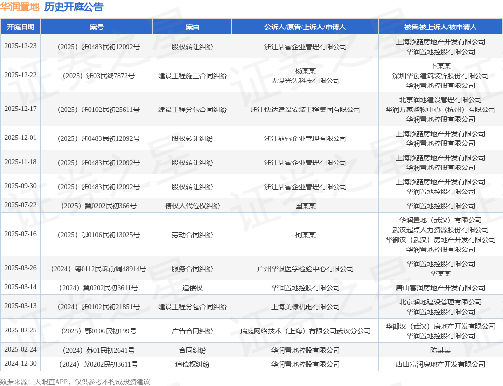 案号:(2025)浙03民终7872号根据统计,近一年内以华润置地控股有限公司为当事人的历史开庭公告有14则,其中案由为“股权转让纠纷”的公告以4则居首,其次为“建设工程分包合同纠纷”有2则,“债权人代位权纠纷”有1则。历史开庭公告如下: