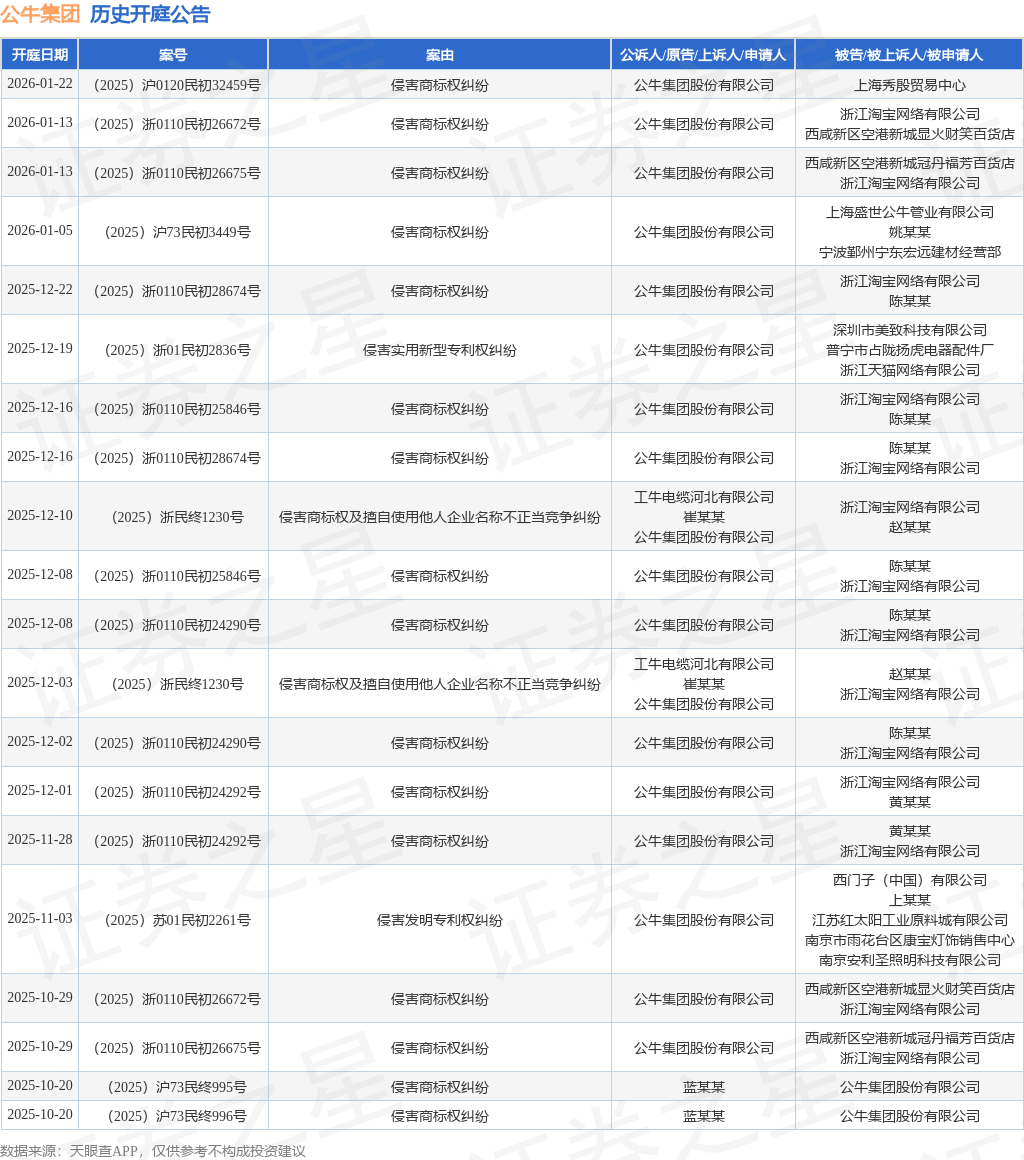 案号:(2025)浙0110民初28674号根据统计,近一年内以公牛集团股份有限公司为当事人的历史开庭公告有145则,其中案由为“侵害商标权纠纷”的公告以110则居首,其次为“不正当竞争纠纷”有15则,“服务合同纠纷”有3则。历史开庭公告(前20条)如下: