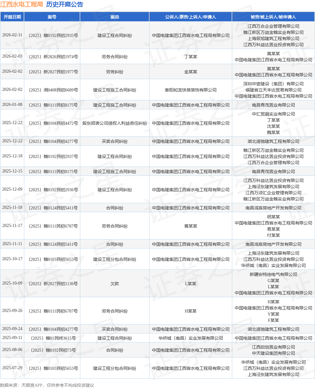 证券之星消息,根据天眼查APP显示,近日公布了一则中国电建集团江西省水电工程局有限公司作为原告/上诉人的开庭公告,详细内容如下: