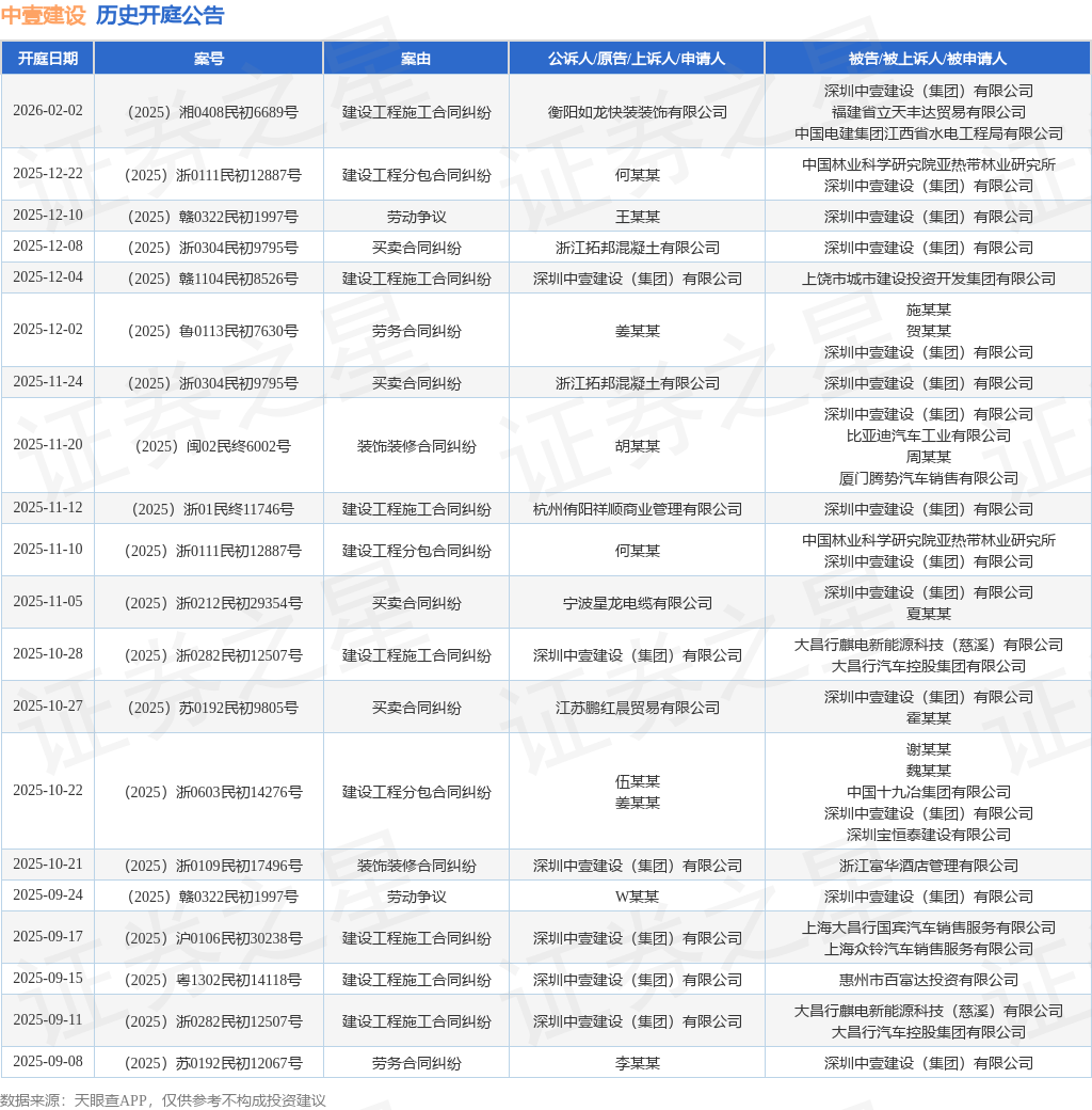 证券之星消息,根据天眼查APP显示,近日公布了一则深圳中壹建设(集团)有限公司作为被告/被上诉人的开庭公告,详细内容如下: