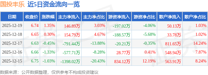 证券之星消息,截至2025年12月19日收盘,国投丰乐(000713)报收于6.74元,上涨1.35%,换手率1.18%,成交量7.23万手,成交额4852.62万元。