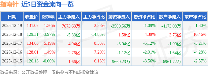 证券之星消息,截至2025年12月19日收盘,指南针(300803)报收于131.07元,上涨1.36%,换手率4.08%,成交量24.43万手,成交额32.19亿元。