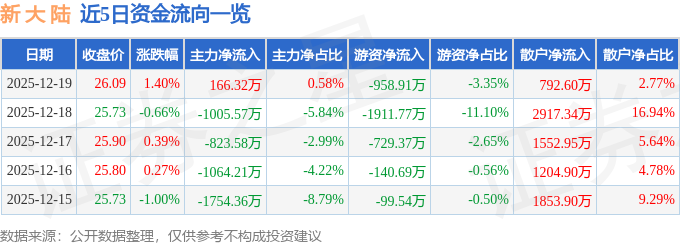 证券之星消息,截至2025年12月19日收盘,新 大 陆(000997)报收于26.09元,上涨1.4%,换手率1.09%,成交量10.98万手,成交额2.86亿元。