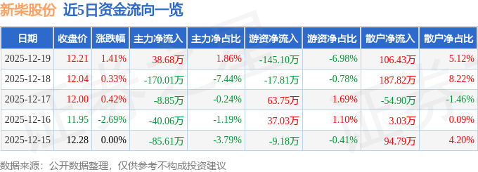 证券之星消息,截至2025年12月19日收盘,新柴股份(301032)报收于12.21元,上涨1.41%,换手率1.07%,成交量1.71万手,成交额2080.13万元。