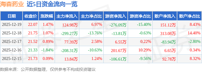 证券之星消息,截至2025年12月19日收盘,海森药业(001367)报收于22.07元,上涨1.47%,换手率2.05%,成交量8145.0手,成交额1793.19万元。