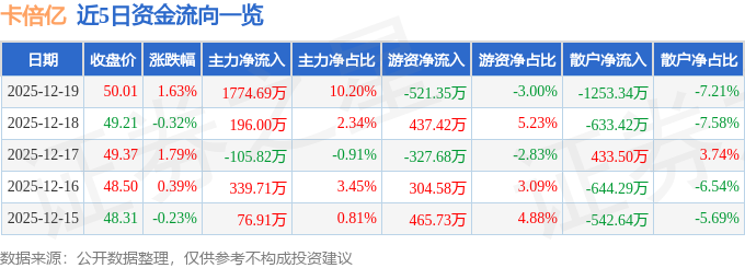 证券之星消息,截至2025年12月19日收盘,卡倍亿(300863)报收于50.01元,上涨1.63%,换手率1.92%,成交量3.47万手,成交额1.74亿元。