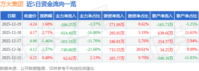 证券之星消息,截至2025年12月19日收盘,方大集团(000055)报收于4.24元,上涨1.68%,换手率1.11%,成交量7.48万手,成交额3155.43万元。
