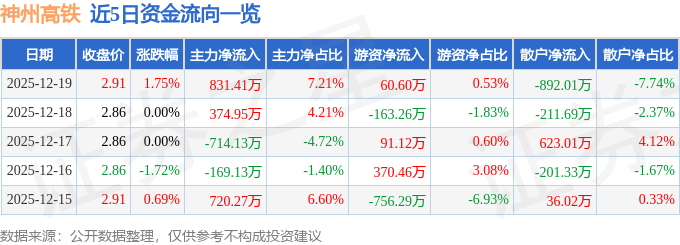 证券之星消息,截至2025年12月19日收盘,神州高铁(000008)报收于2.91元,上涨1.75%,换手率1.47%,成交量39.79万手,成交额1.15亿元。