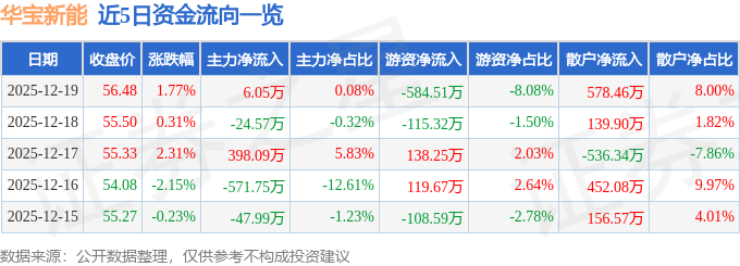 证券之星消息,截至2025年12月19日收盘,华宝新能(301327)报收于56.48元,上涨1.77%,换手率1.68%,成交量1.28万手,成交额7231.25万元。