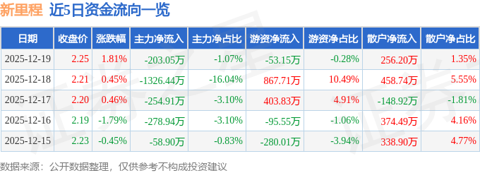 证券之星消息,截至2025年12月19日收盘,新里程(002219)报收于2.25元,上涨1.81%,换手率2.58%,成交量84.5万手,成交额1.9亿元。