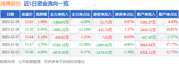 证券之星消息,截至2025年12月19日收盘,鸿博股份(002229)报收于15.61元,上涨1.89%,换手率4.08%,成交量20.12万手,成交额3.12亿元。