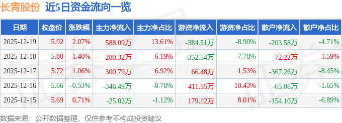 证券之星消息,截至2025年12月19日收盘,长青股份(002391)报收于5.92元,上涨2.07%,换手率1.58%,成交量7.36万手,成交额4321.07万元。