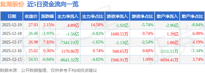 12月19日的资金流向数据方面,主力资金净流入4.89亿元,占总成交额14.58%,游资资金净流出1.92亿元,占总成交额5.74%,散户资金净流出2.96亿元,占总成交额8.84%。