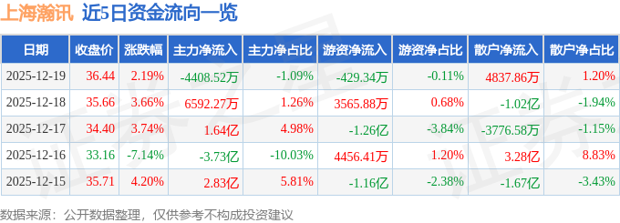 证券之星消息,截至2025年12月19日收盘,上海瀚讯(300762)报收于36.44元,上涨2.19%,换手率17.58%,成交量110.38万手,成交额40.33亿元。