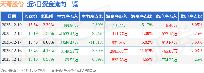 证券之星消息,截至2025年12月19日收盘,天奇股份(002009)报收于15.54元,上涨2.3%,换手率2.53%,成交量8.95万手,成交额1.39亿元。