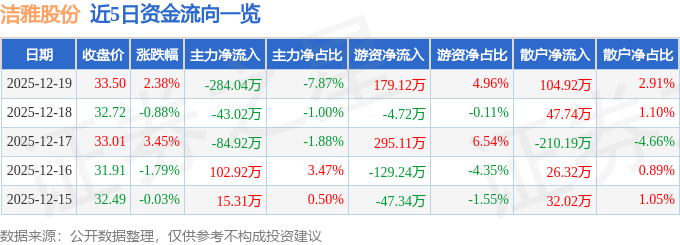 证券之星消息,截至2025年12月19日收盘,洁雅股份(301108)报收于33.5元,上涨2.38%,换手率1.68%,成交量1.08万手,成交额3610.1万元。