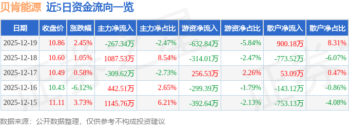 证券之星消息,截至2025年12月19日收盘,贝肯能源(002828)报收于10.86元,上涨2.45%,换手率5.21%,成交量10.09万手,成交额1.08亿元。