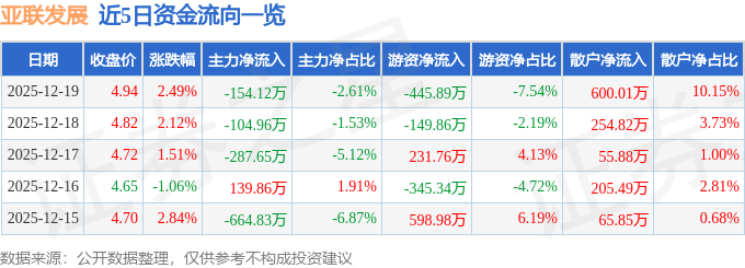 证券之星消息,截至2025年12月19日收盘,亚联发展(002316)报收于4.94元,上涨2.49%,换手率3.54%,成交量12.06万手,成交额5911.56万元。