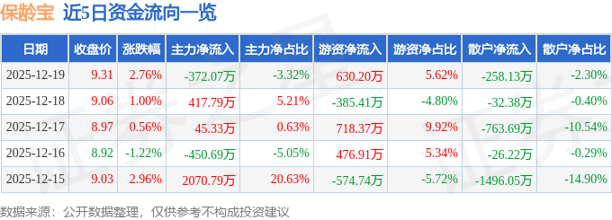 证券之星消息,截至2025年12月19日收盘,保龄宝(002286)报收于9.31元,上涨2.76%,换手率3.29%,成交量12.17万手,成交额1.12亿元。